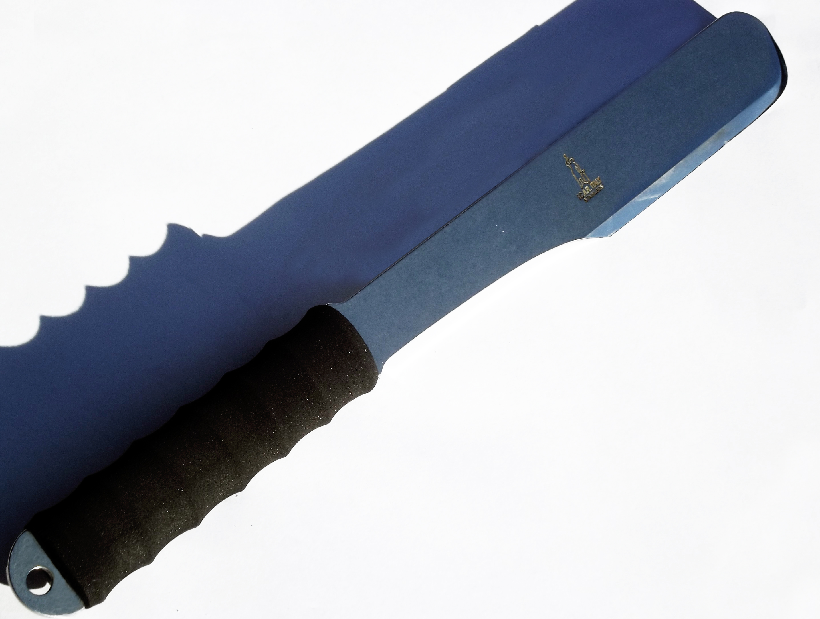 Il manico è in un materiale plastico chiamato EVA (Etilene vinil acetato), che rende unico questo coltello sia per stile sia per le caratteristiche del materiale: ipoallergenico, non si rovina nel tempo, non si deforma, assorbe le vibrazioni, ergonomico, gradevole al tatto, confortevole in mano e con un ottima grip. Un "must have" per gli amanti del coltellaccio!